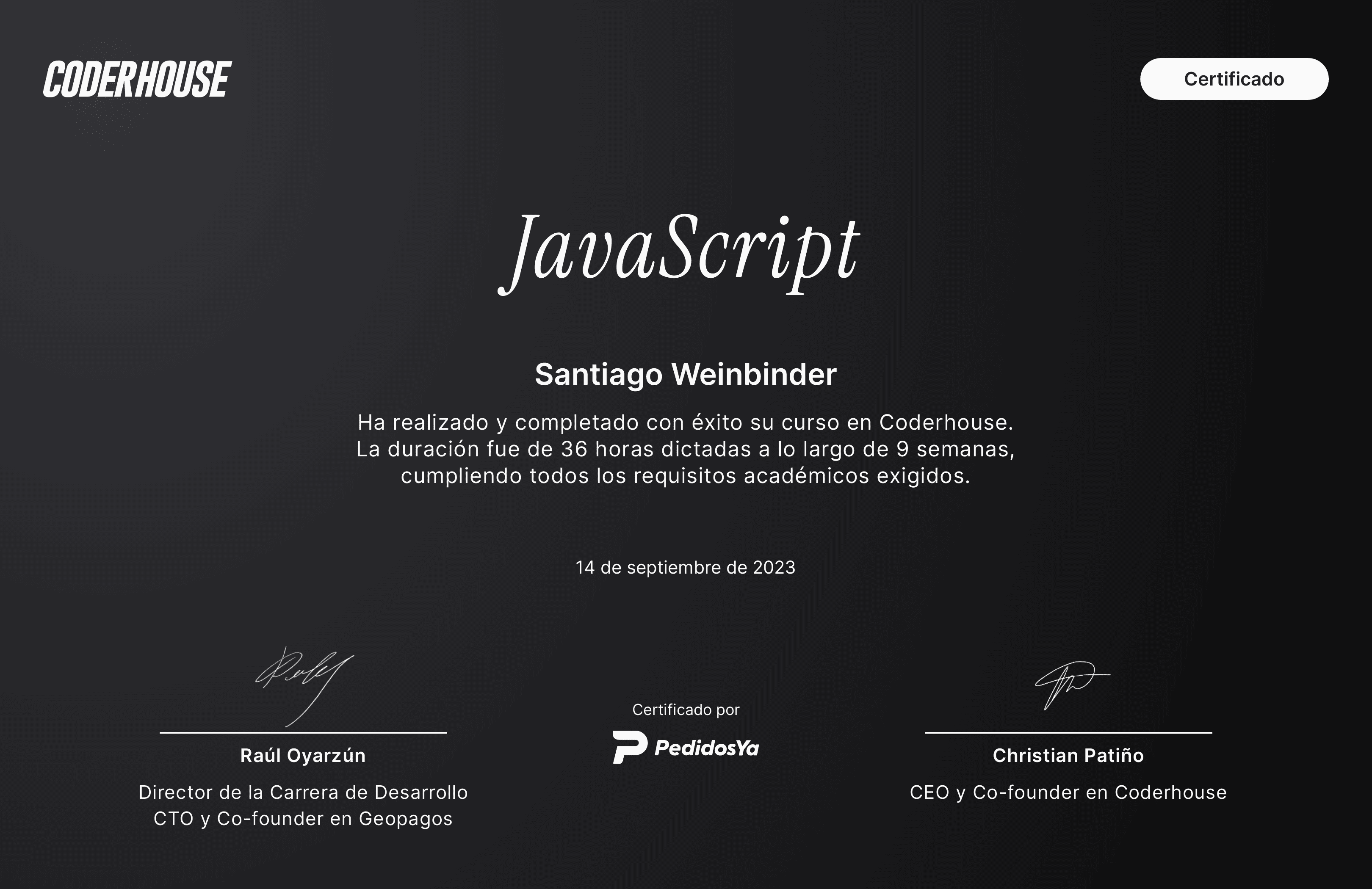 Asistencia 100%, desafíos 100%, nota final 10. Certificado